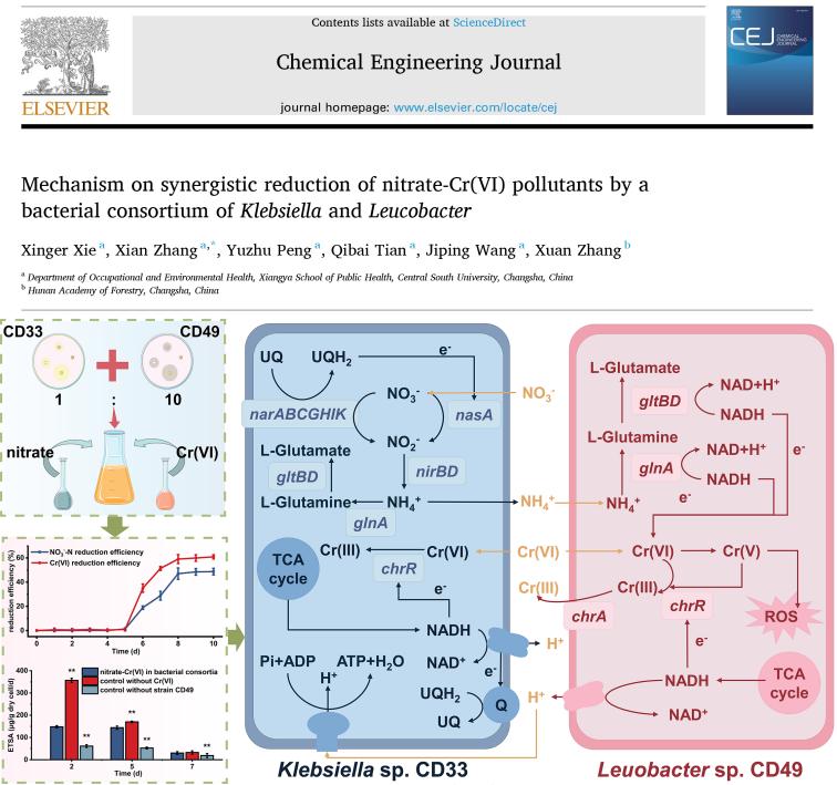 突破单菌功能局限,团队通过构建合成菌群(Klebsiella sp. CD33与Leucobacter sp. CD49),阐明了其通过代谢互补与电子分配以协同去除硝酸盐与Cr(VI)的分子机制。该体系中,CD33利用氮代谢为合成菌群生长提供了氮源支持,CD49则通过特异的Cr(VI)还原缓解毒性胁迫,从而实现复合污染物的高效协同去除。本研究为复合污染的高效生物防治提供了理论支撑与技术指导(Chem Eng J,研究生谢幸儿为第一作者,张宪为通讯作者)。
